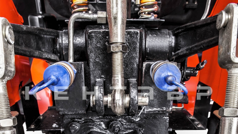 Мини-трактор оснащен трехточечной системой навески оборудования. К ней подключаются тракторные агрегаты, которые характеризуются повышенной эффективностью благодаря возможности обработки больших площадей и более прямолинейному движению по полю. Гидравлическая система рассчитана на подъем и опускание навесного оборудования массой до 350 кг.