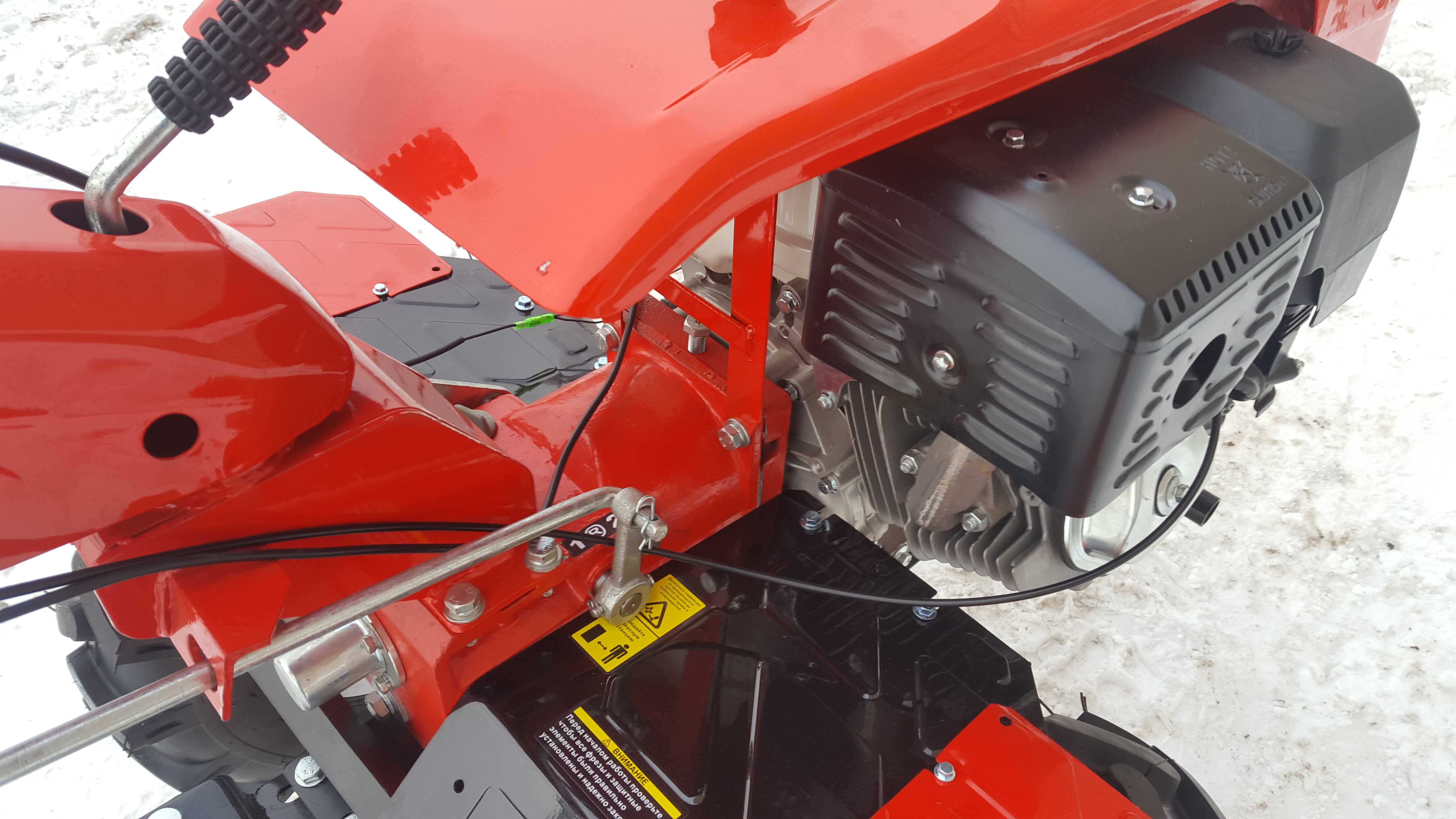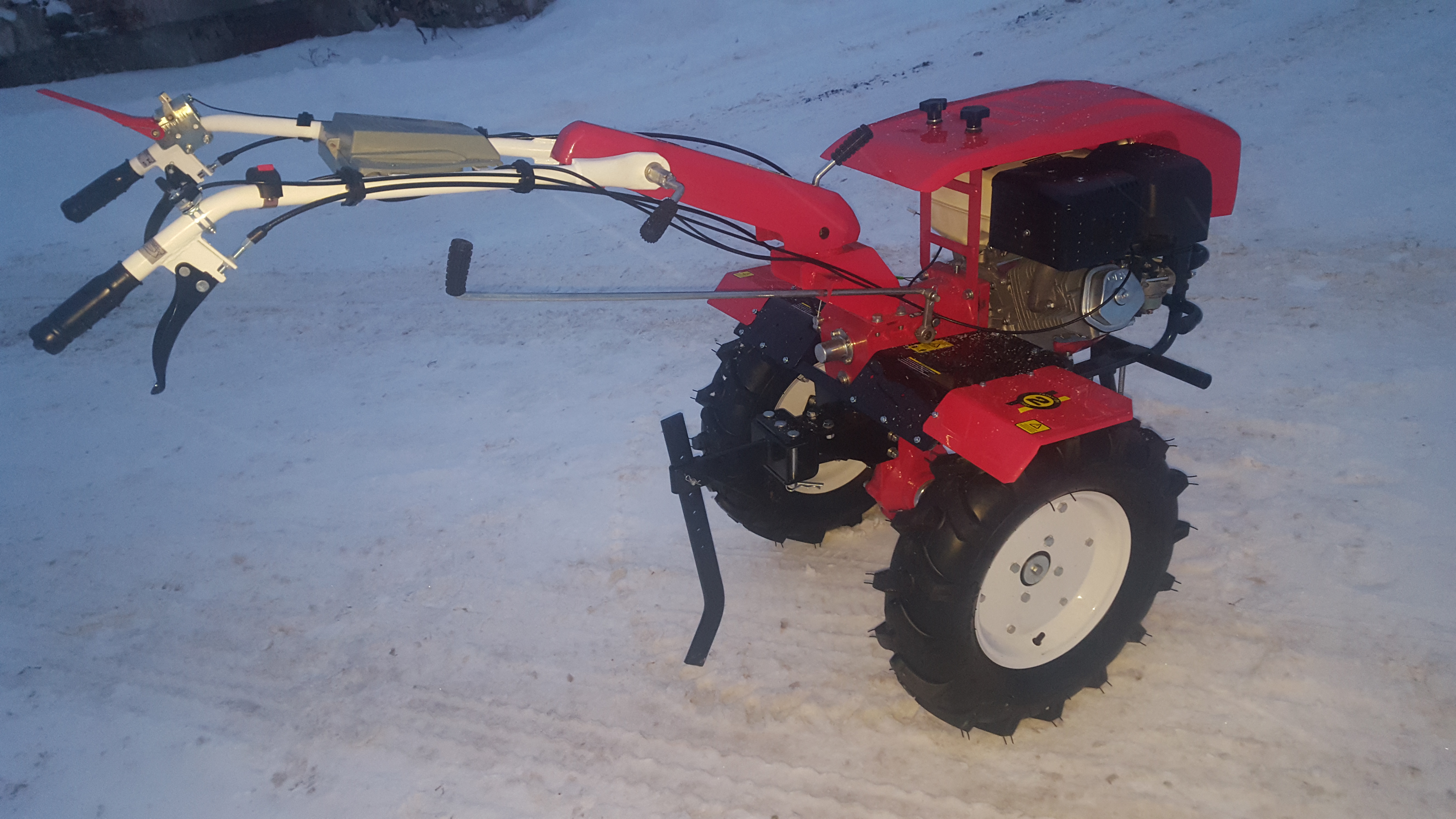 Максимальная комплектация для данной серии агрегатов. «Из коробки» Вы сразу получаете огромные колёса, самый мощный двигатель, культивирующие фрезы, универсальную сцепку, фару для работ в вечернее время и, как приятное дополнение, удобный бардачок на ручке. Так же в комплекте идет специальная защита на колеса, которая защищает фермера от земли и грязи.