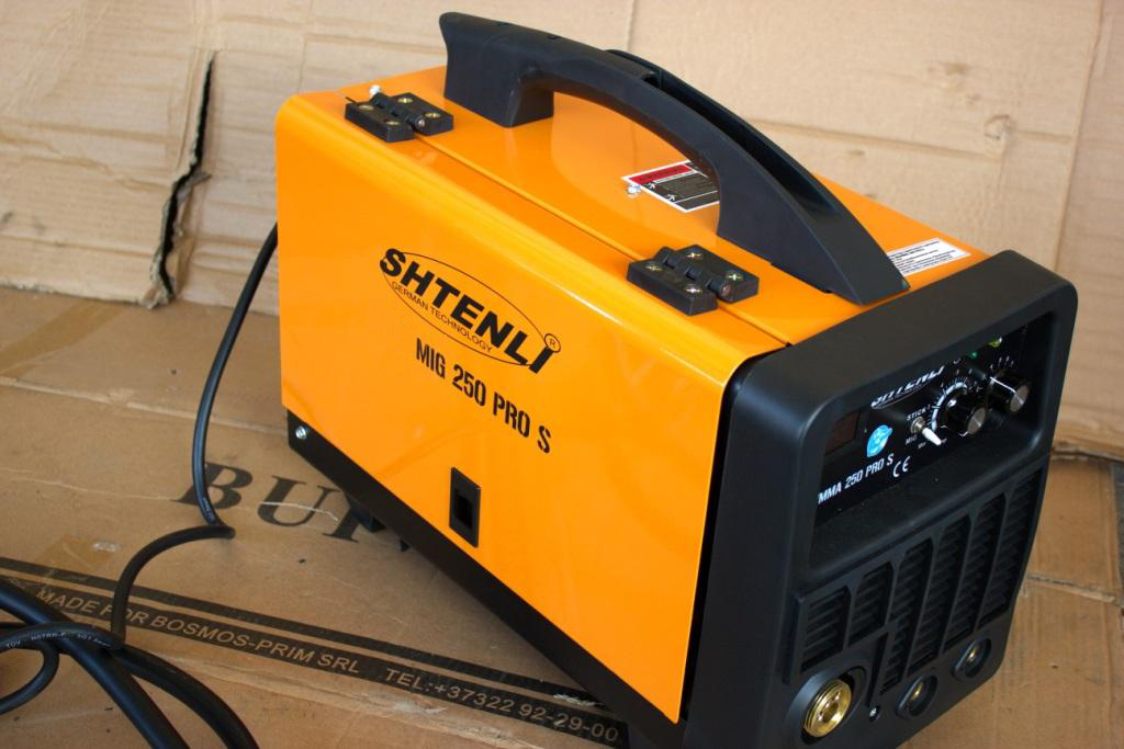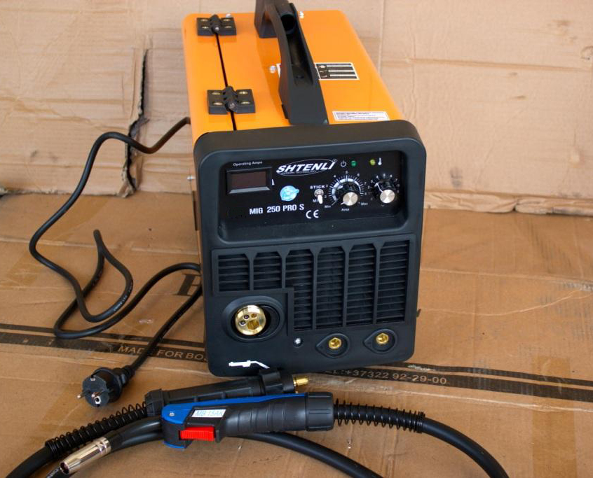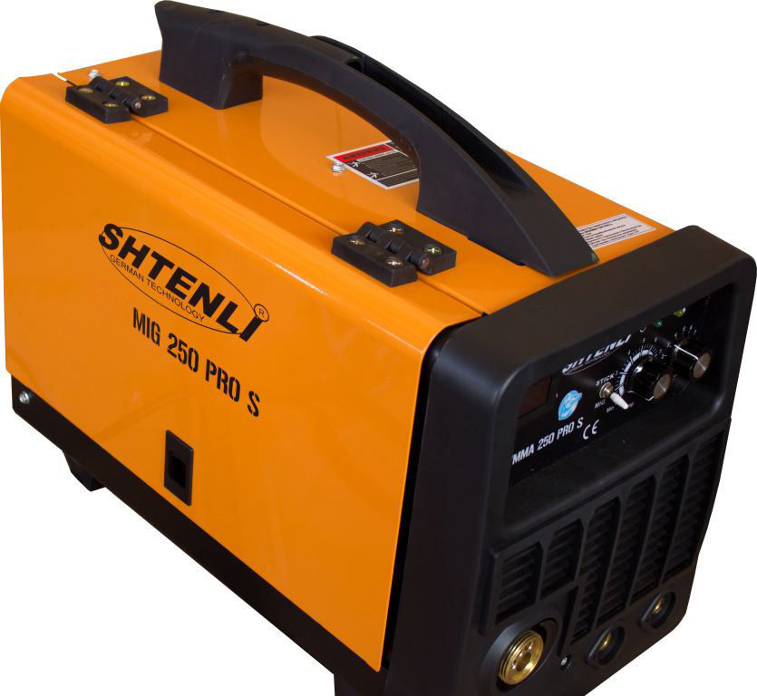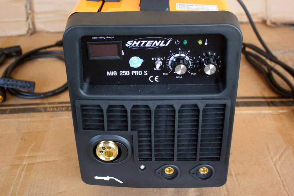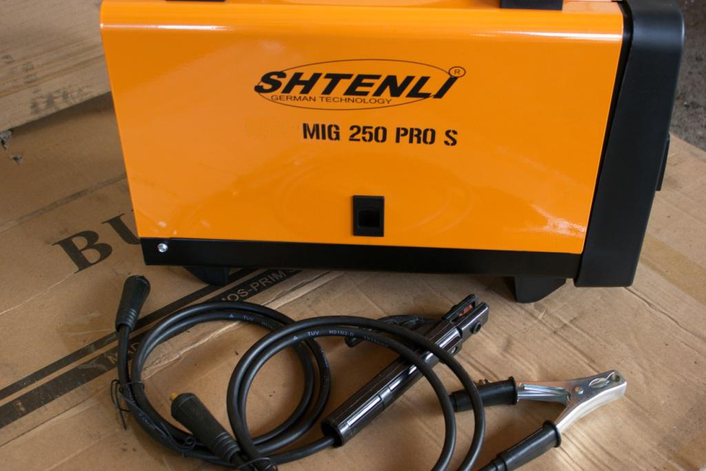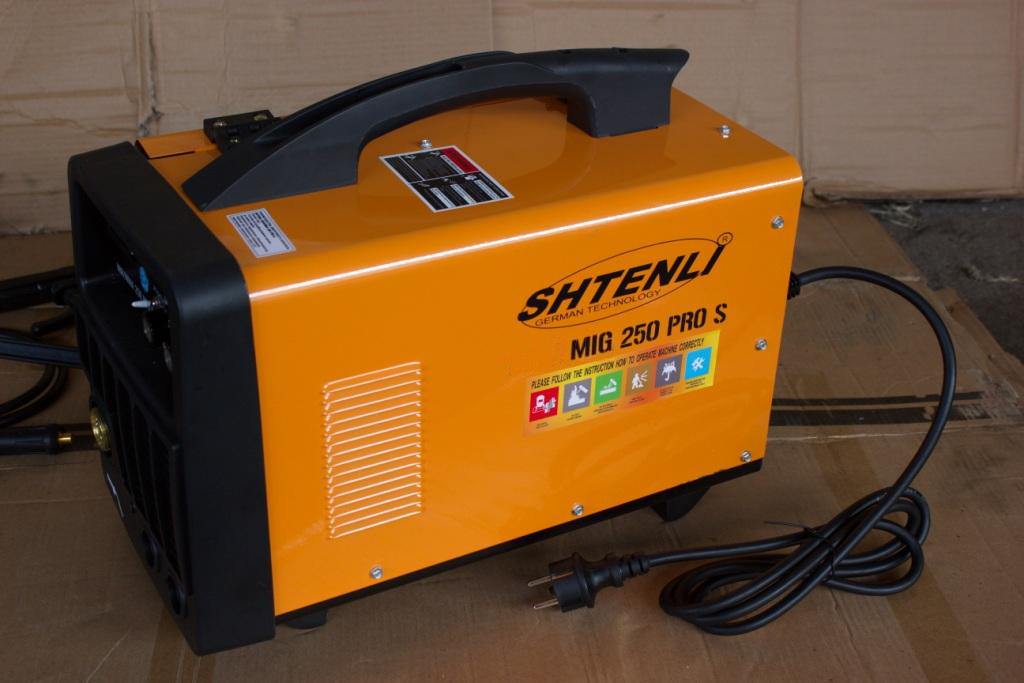 Shtenli MIG 250 PRO S. Аппарат предназначен для проведения сварочных работ проволокой. Стабильный провар металла, система антиразбрызгивания металла во время сварки, мощная система выпрямления и выравнивания тока включает фильтр и стабилизатор тока. Имеет встроенный вентилятор охлаждения и плавную регулировку сварочного тока. Позволяет применять рабочий режим автоматического поддержания / угасания дуги, способного удовлетворить различные требования к сварке. Включает функцию капельного переноса в процессе сварки, обеспечивает высокий уровень напряжения холостого хода, медленную скорость подачи проволоки, практически безотказное возбуждение дуги. Позволяет использовать проволоку диаметром 0,6-0,8 мм, как и низколегированную, так и нержавеющую и для специальных сталей.